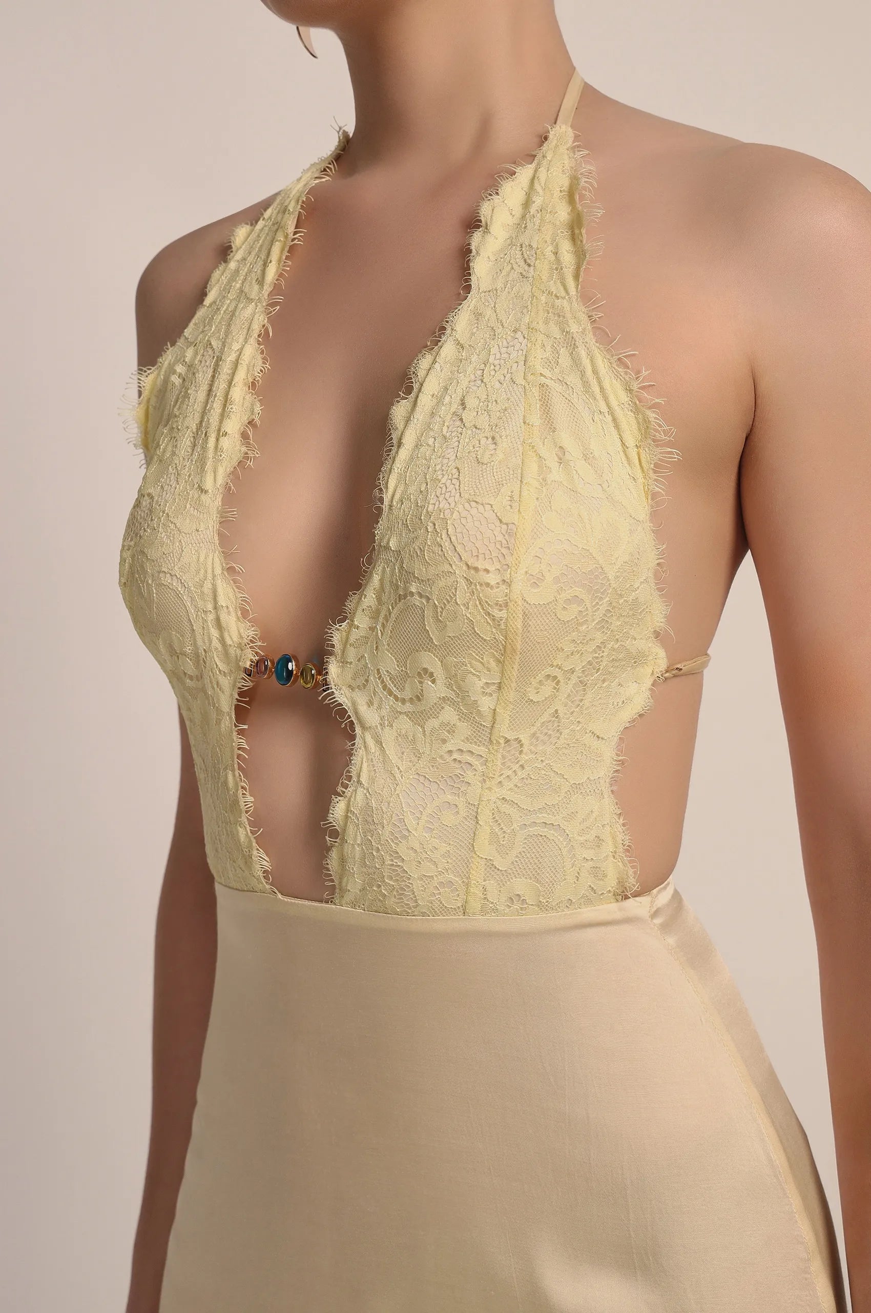 A sizzling sensation that will leave everyone breathless! MVRI’s Capri is designed to unleash your inner goddess and leave them wanting more. This gorgeous halter neck beauty with the most sultry backless bustier adorned with semi-precious gemstone will accent that fabulous body in the most divine way possible!