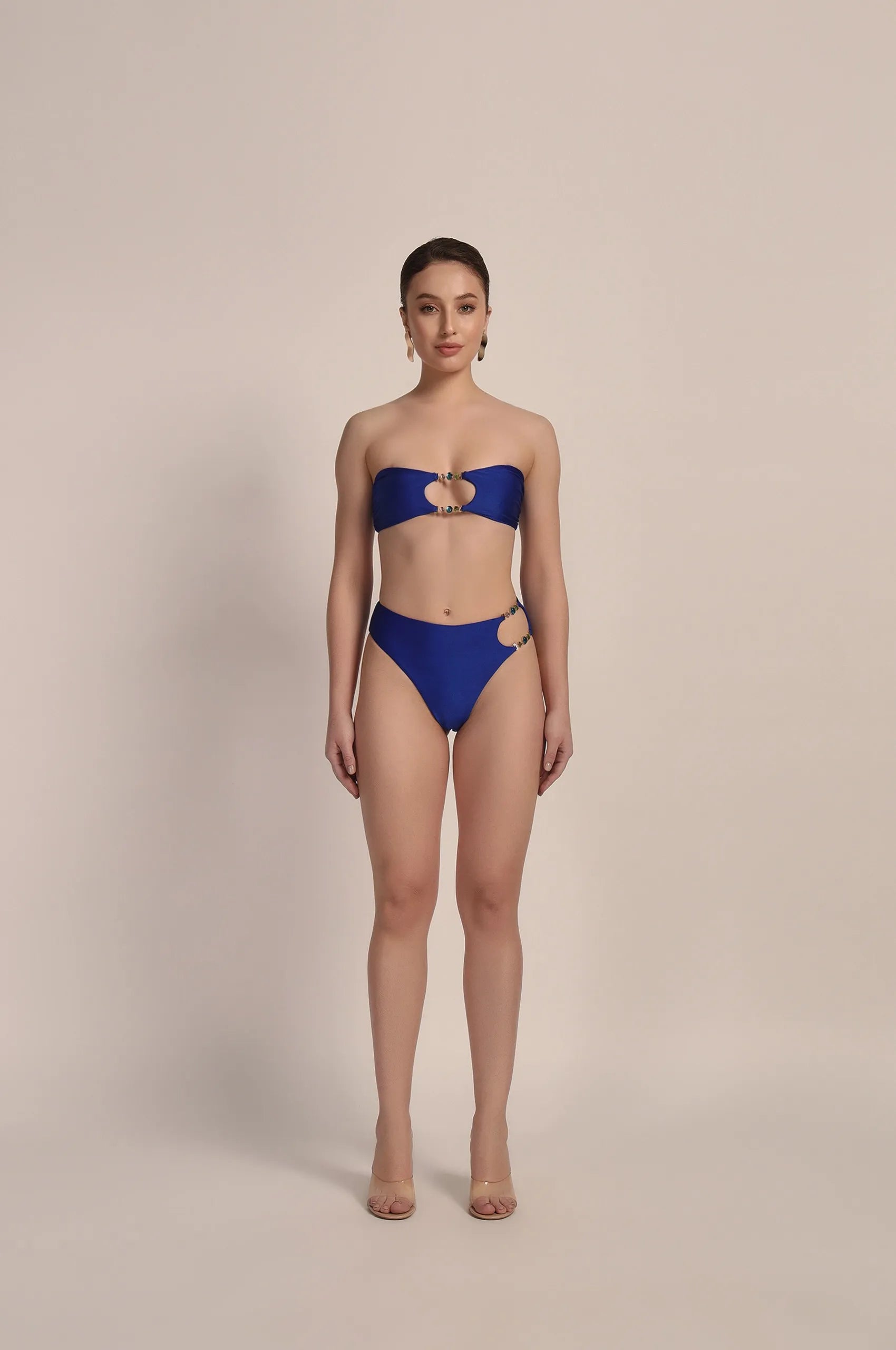 Find yourself on the coasts of Paradise with our DIANE Bandeau top. Embrace your sensuality with the most jaw-dropping bikini top ever! Featuring sultry semi-precious gemstone encased cut-out detail, a luxurious custom branding lock closure, and removable straps for extra oomph of support.