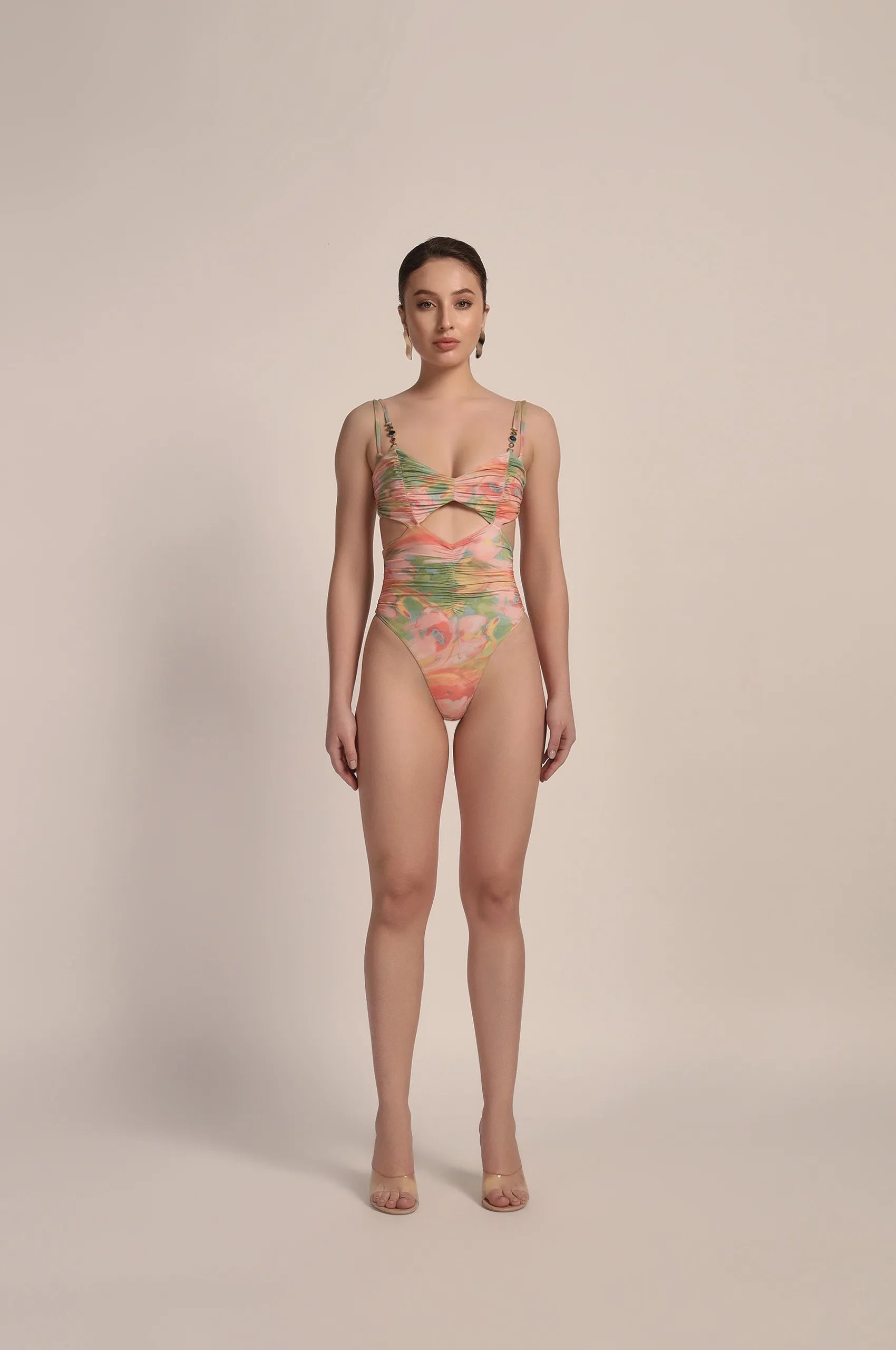 Wondering what’s missing in your wardrobe? Show off your stunning silhouette in MVRI’s sensational ruched one piece bodysuit with the most sensual cut-out details. A mesmerizing semi-precious gemstone-adorned double strap detailed swimsuit that cinches your waist and lengthens those fabulous legs.