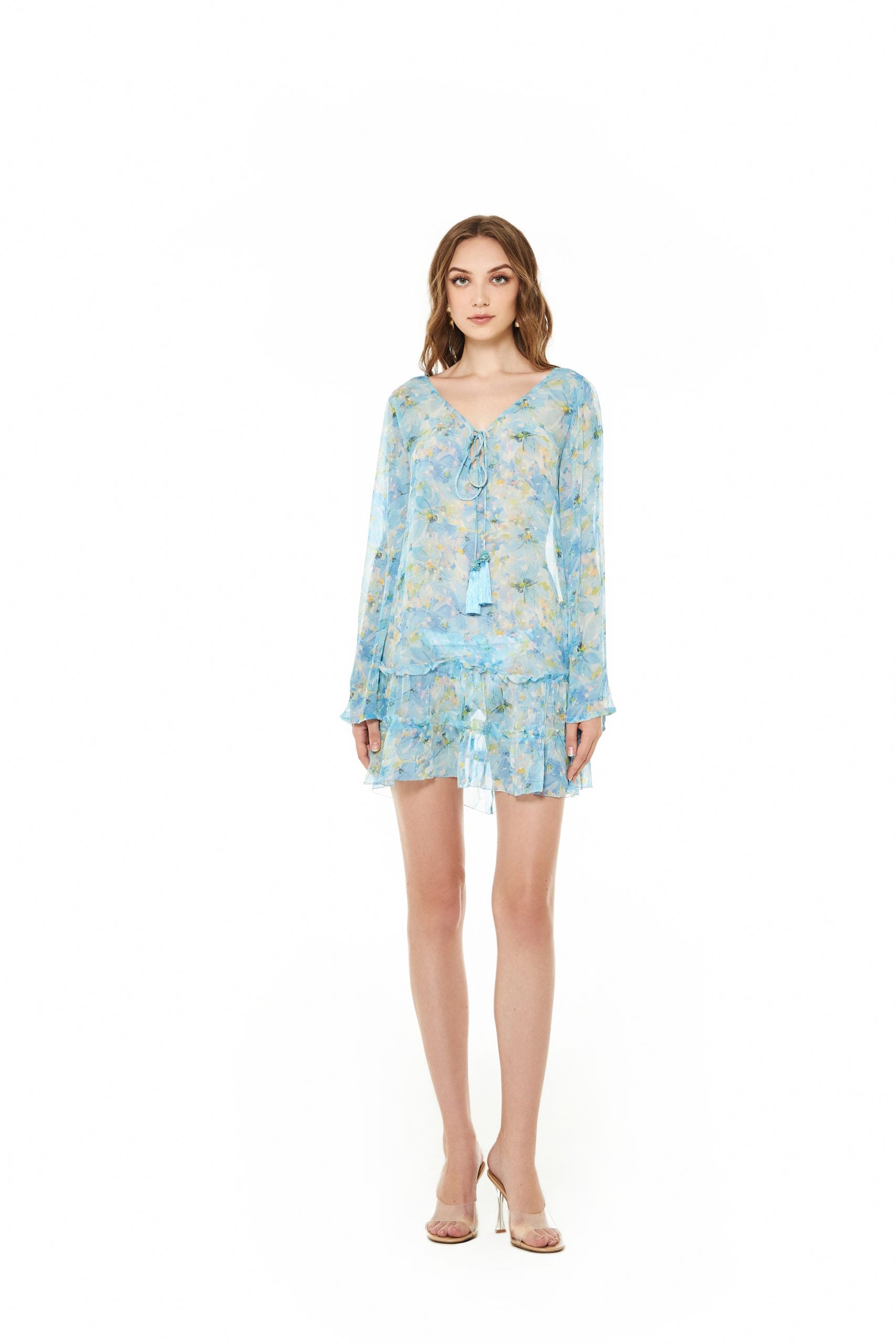 100% silk Romantic ruffle trim Jewel head silk thread tassel attachment at neck tie cord Flowy silhouette Plunge neckline